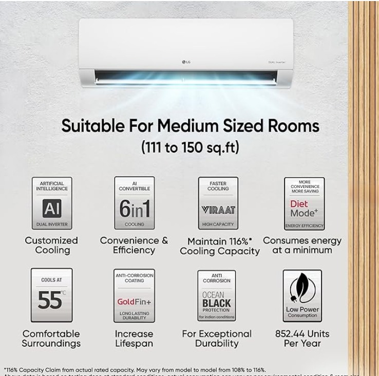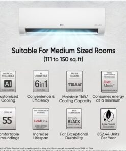 - LG Split AC with Dual inverter compressor: Experience powerful cooling with LG Split AC, featuring an energy-efficient inverter compressor for optimal performance and long-lasting durability.